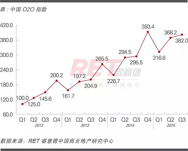 2015年第三季度,中國O2O指數(O2OI)382.0,上升13.8點,環比上漲3.7%,同比上漲29.3%。