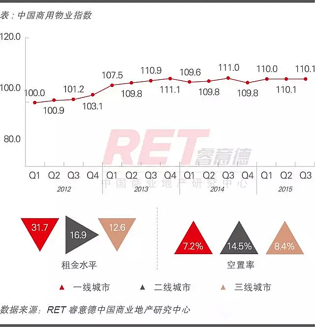 2015年第三季度,中國商用物業指數(CRI)為110.1,環比持平,同比下跌0.8%。第三季度商業營業用房投資占比繼續上升,而大量新項目入市,導致平均租金下滑,空置率上升,預計消化期將持續0.5-1年時間。
