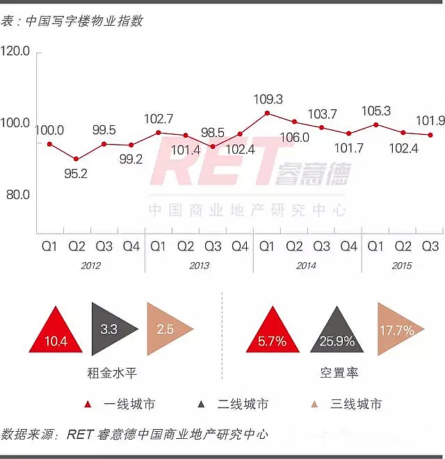2015年第三季度,中國寫字樓物業指數(COI)101.9,下降0.5點,環比下跌0.5%,同比下跌1.7%。受宏觀經濟放緩影響,第三季度辦公樓投資占比維持上季度走低趨勢,寫字樓市場整體回歸穩定。