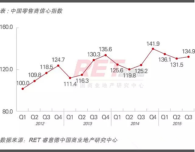 2015年第三季度,中國零售商信心指數(RCI)134.9,上升3.4點,環比上漲2.6%,同比上漲7.8%。