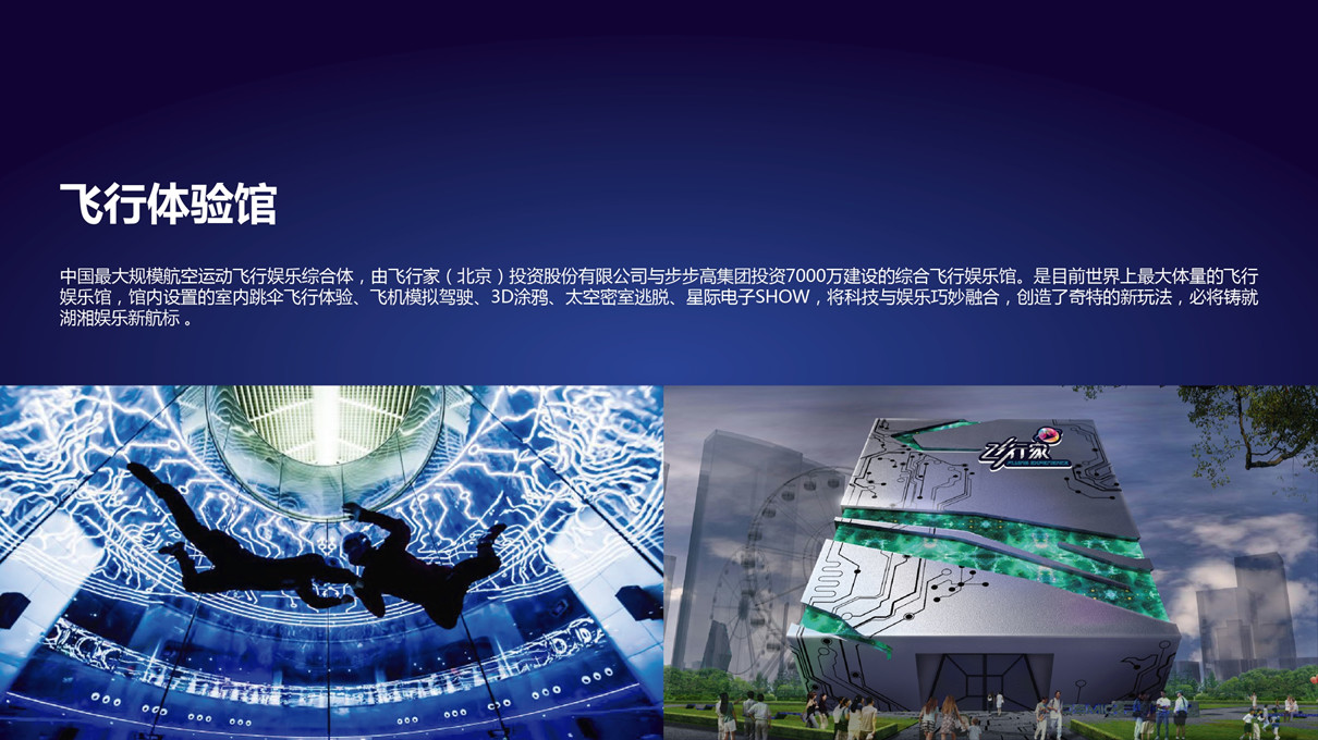 是步步高新天地旗下各旅游類業態,經過全新要素整合,歡樂升級后的典型城市近郊輕度假文旅綜合體。目前涵蓋了中國眾多獨一無二的文化旅游項目:世界最大的航空運動飛行娛樂綜合體—飛行體驗館;中國最大的商業綜合體類主題樂園—云頂星河游樂園……