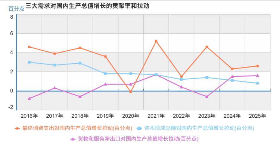 從最近10年來看,在中國經(jīng)濟(jì)的三駕馬車中,消費對GDP(國內(nèi)生產(chǎn)總值)的貢獻(xiàn)地位提升、結(jié)構(gòu)優(yōu)化,盡管波動明顯,但已成為經(jīng)濟(jì)穩(wěn)定運行關(guān)鍵支撐。2025年最終消費支出對GDP增長拉動達(dá)到2.6個百分點。
